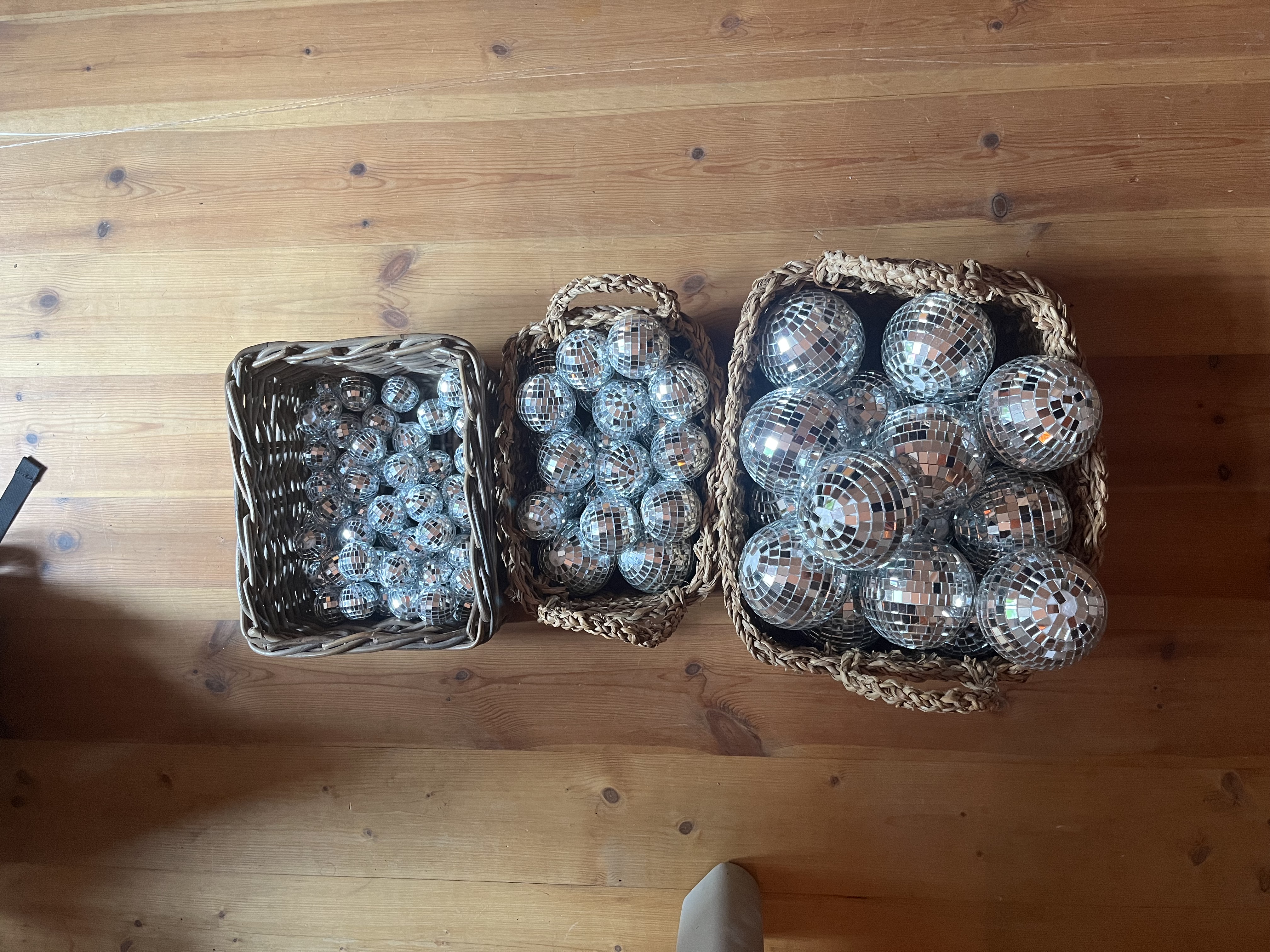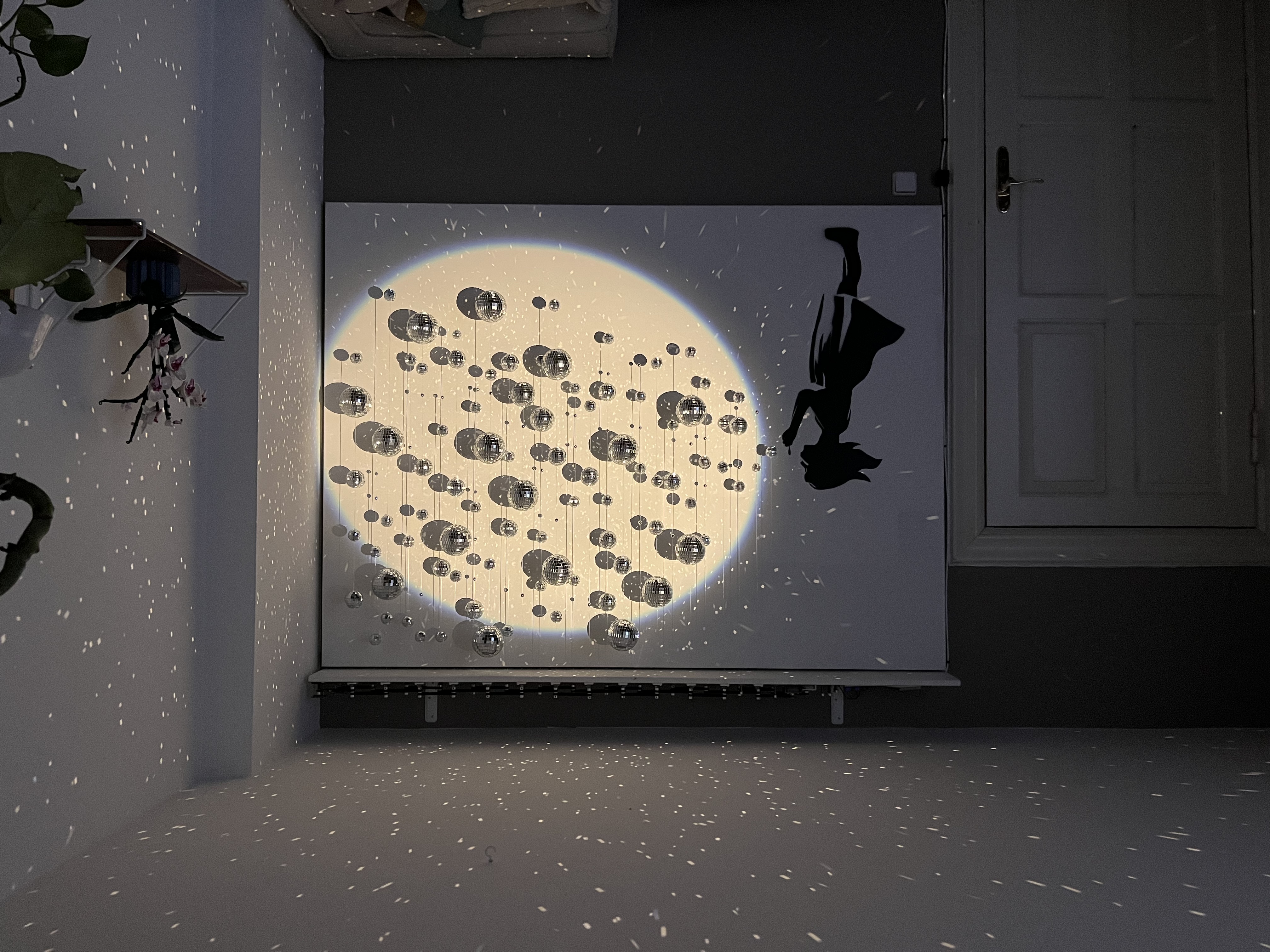 The piece consists of stenciled spray paint on 2m by 1.5m canvas stretched on a standard frame. The disco balls are hung on 2mm-thick clear acrylic strands, which balance the strength needed to support the heaviest axis of balls while remaining as slim as possible to not distract from the rest of the artwork. There are two full rows of hanging pieces in order to add some depth to the cloud of balls.