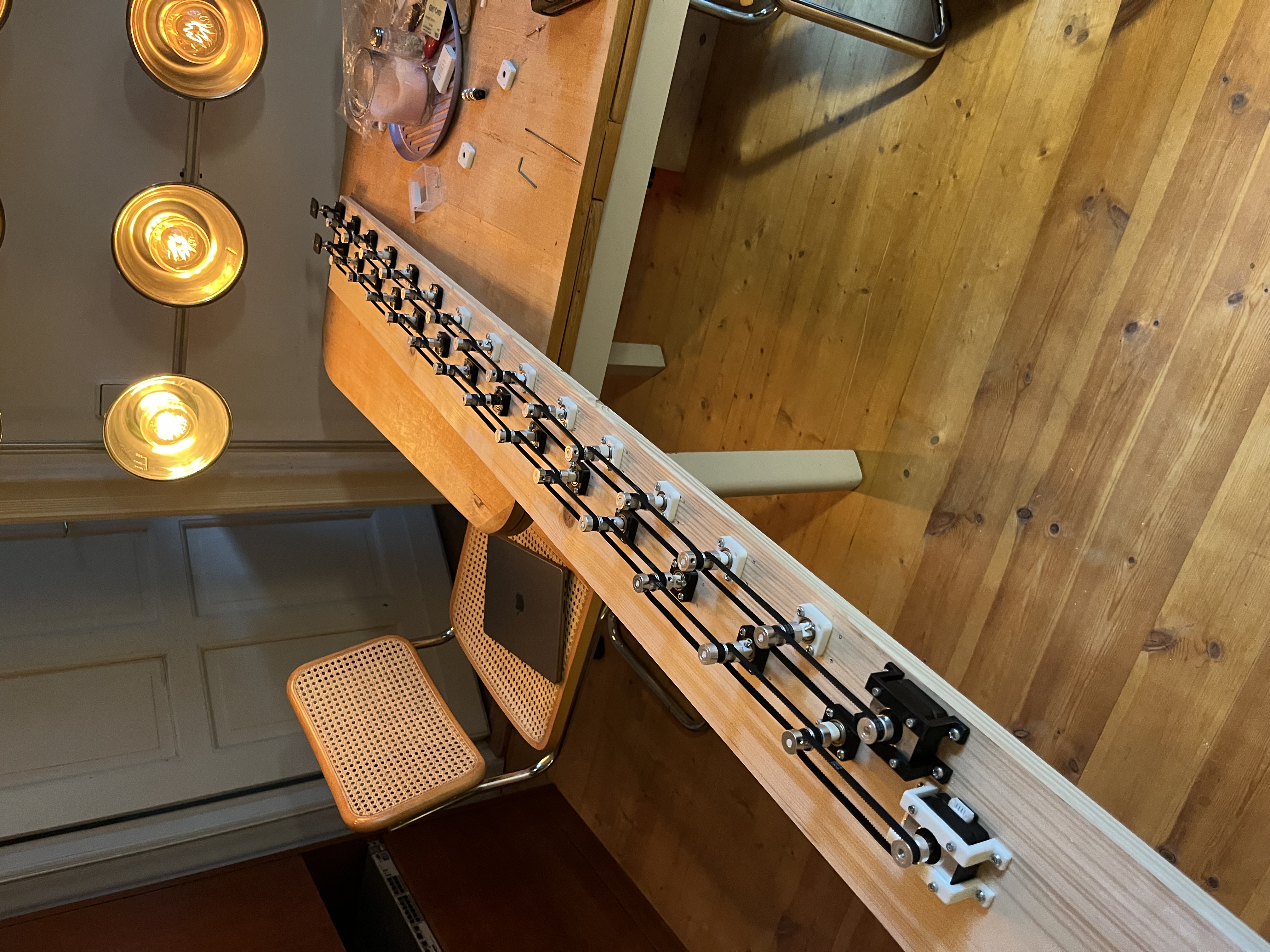 Each ‘axis’ of acrylic passes through the mounted overhang and through a 3D printed mount with a set screw which keeps the acrylic strand aloft. Each 3D printed mount is seated in a standard ball bearing, which is then press-fit into another 3D printed base that screws into the overhang.