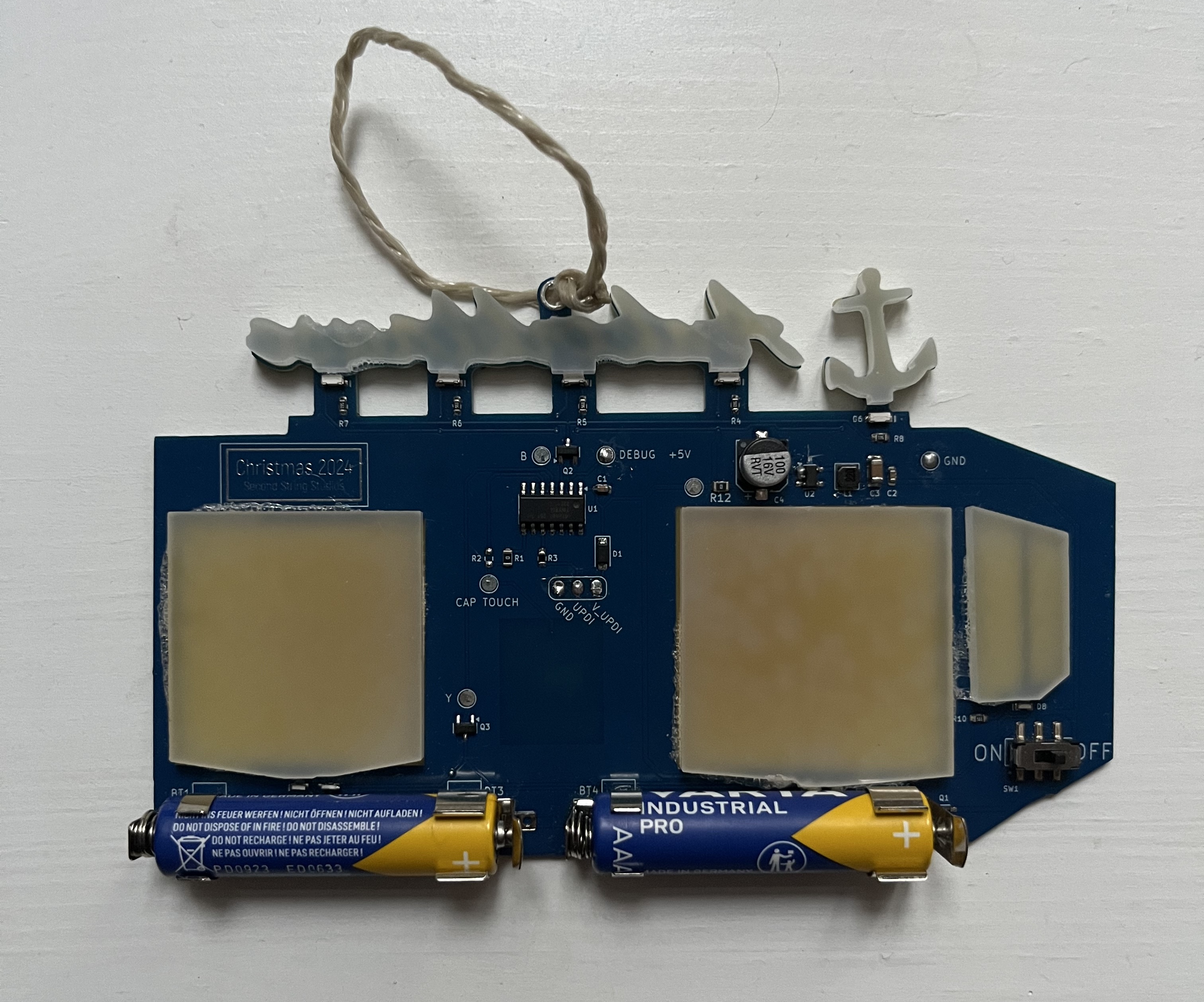 There is a hardware on/off switch that cuts battery power on and off to the full circuit. The LEDs are activated using a capacitive touch pad on the front side, designed in the soldermask as a fingerprint whorl.