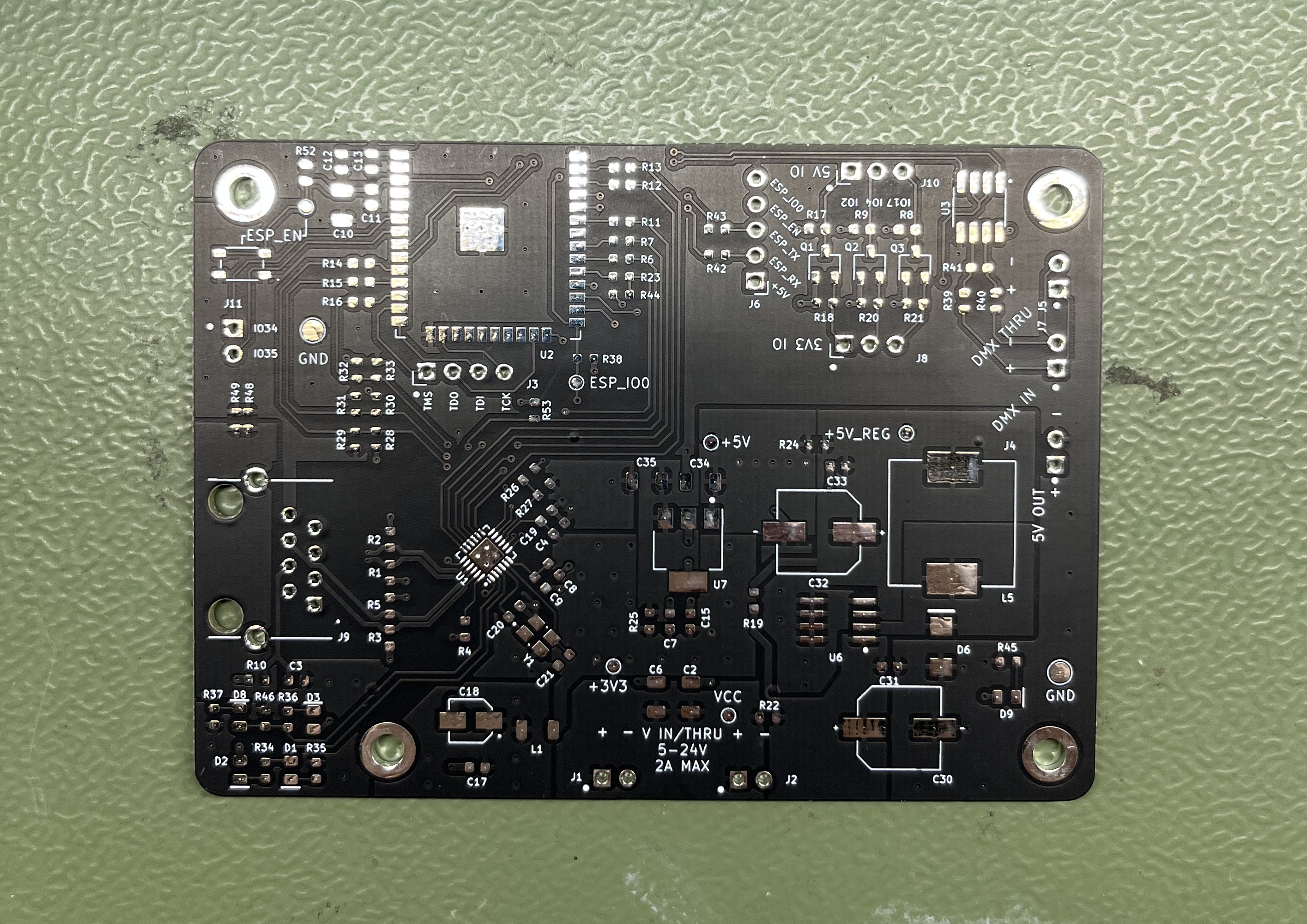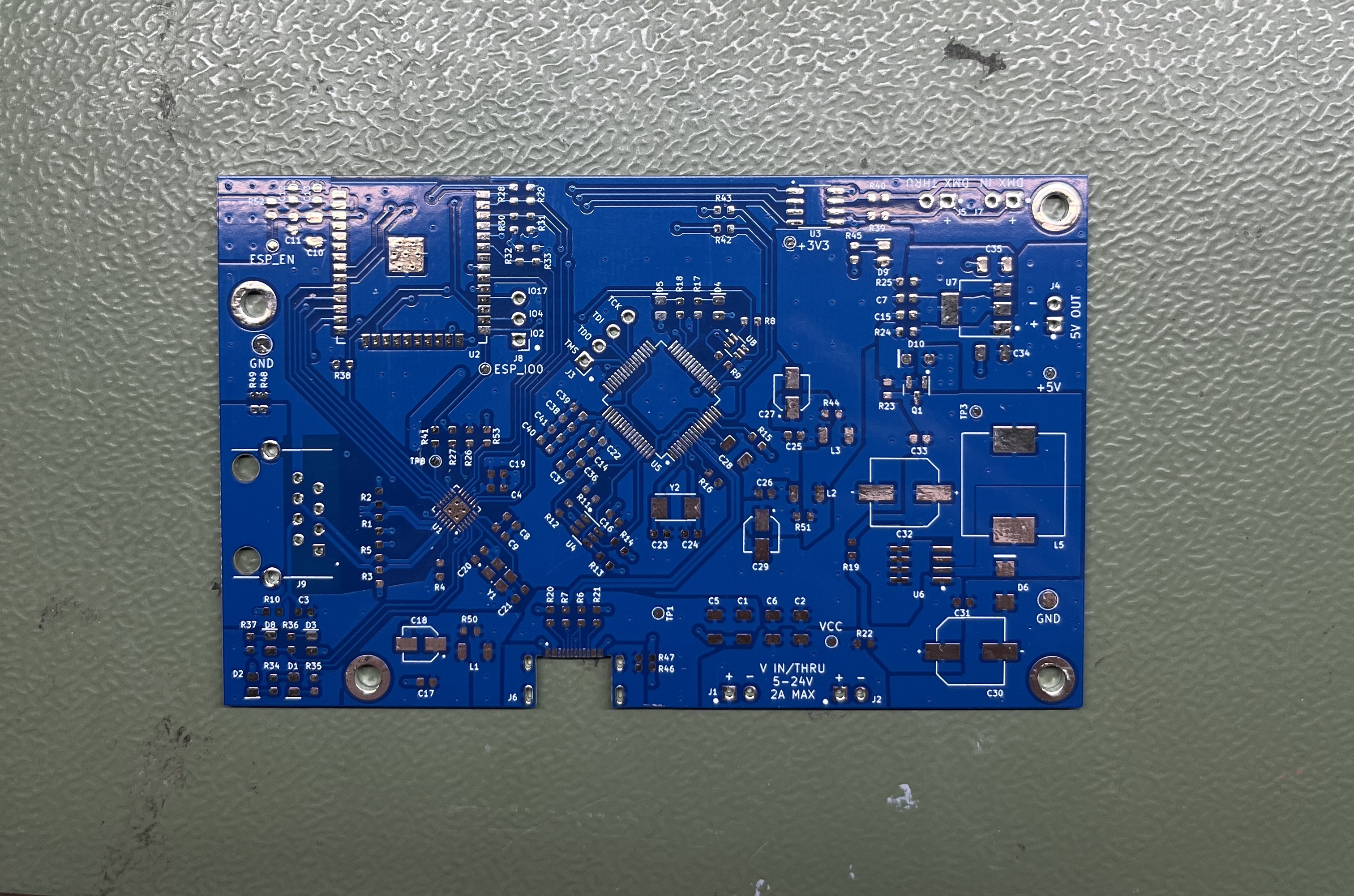 Rev. 2.0 fixes the main mistakes of rev. 1.0 while maintaining the full functionality. It also communicates over 10/100Base-T ethernet, with DMX input and output. It supports input power of 5-24V, which is passed out directly and also regulated with a switching regulator for a 5V output rail that can support up to 2A. This could be used to power medium-sized lighting fixtures but was ultimately removed in the next revision due to lack of use, parts cost, and board space. Three level-shifted IOs can be accessed at the 3V3 or 5V levels. These are used for LED strip pixel data output. All non-ethernet PCB inputs and outputs are exposed with screw terminals.